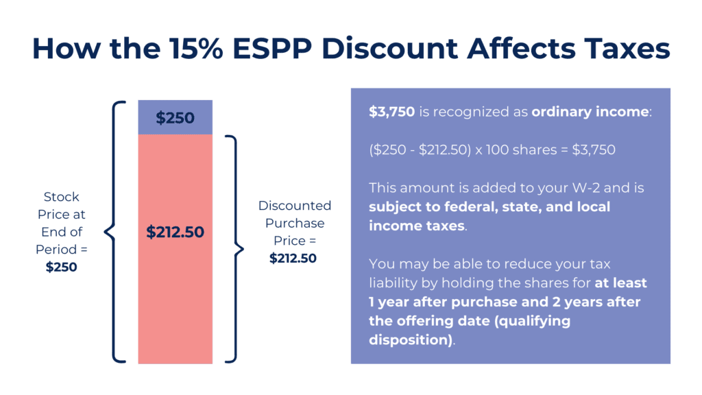 So, if the stock price at the end of the period is $250 and you purchase 100 shares for $212.50 per share, $3,750 is recognized as ordinary income: