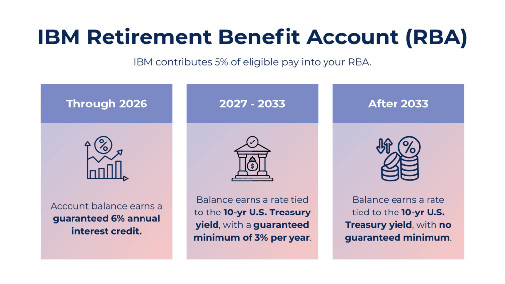 Specifically, IBM contributes 5% of eligible pay into the RBA. Through 2026, those balances earn a guaranteed 6% annual interest credit. After that, the account will earn a rate tied to the 10-year U.S. Treasury yield, with a guaranteed minimum of 3% per year through 2033.