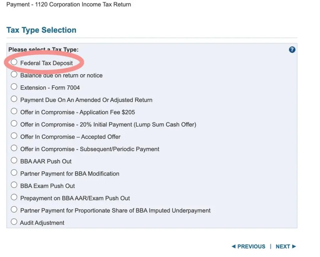 3. Select “Federal Tax Deposit” –> Next. This is the option to make an estimated tax payment. On the following page, verify the correct tax year.