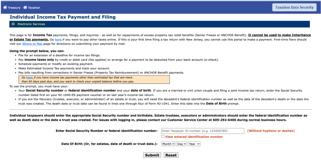 Note: If you’ve never filed a NJ tax return before, you can’t use this online portal yet. You’ll have to mail in a check with a Form NJ-1040-ES voucher until your first return is filed and processed.