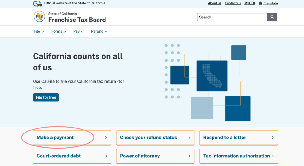 1. To make California estimated tax payments, go to the State of California Franchise Tax Board’s home page and select “Make a Payment.”