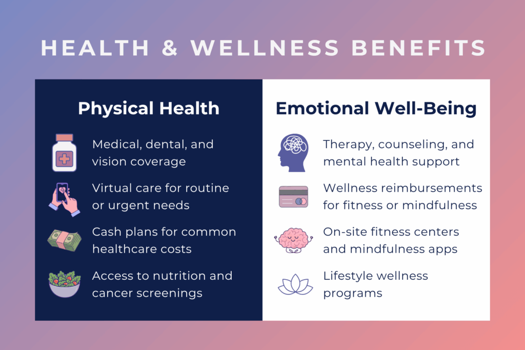 - Lifestyle wellness options. Employees can take advantage of wellness programs, on-site fitness centers, and mindfulness apps designed to support overall well-being.