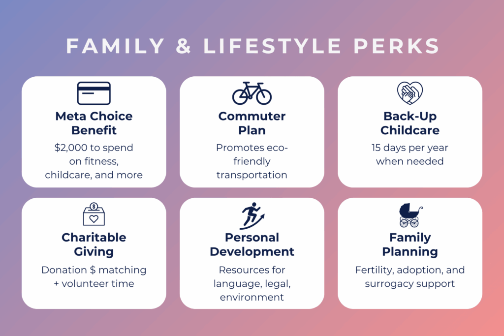 Meta provides a wide range of benefits to support employees’ families, personal interests, and communities.