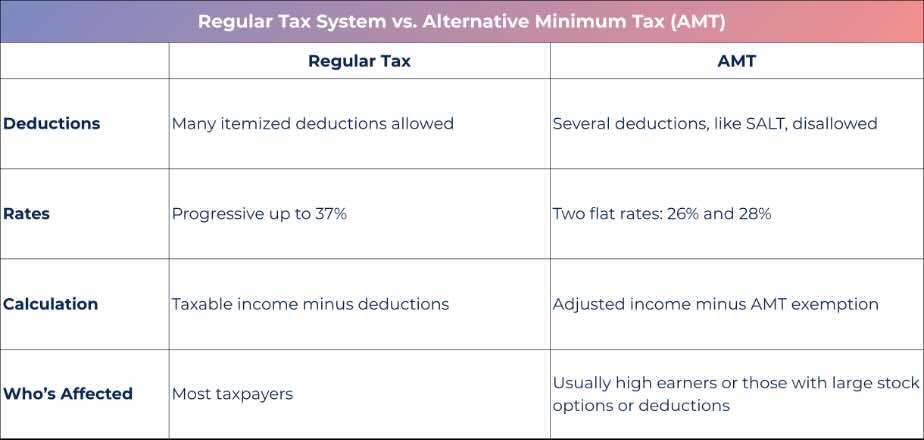 Think of it as a parallel set of rules. You calculate your taxes twice: once the regular way, and once under the AMT system. You then pay whichever amount is higher.